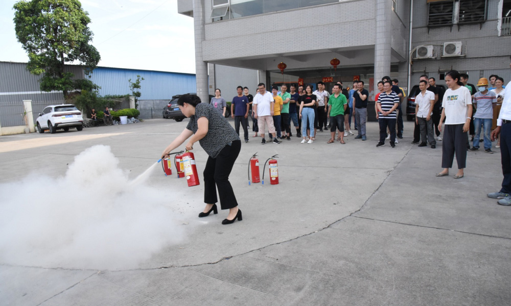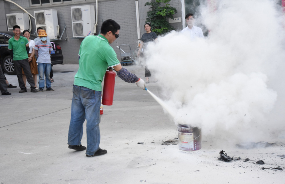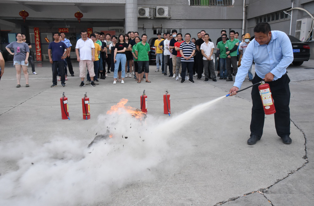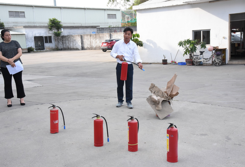 在灭火实战演练中,公司安全生产负责人指导大家手持干粉灭火器对准火源根部由远及近进行扫射扑灭火源的实际操作,提高了员工扑救初期火灾的能力。公司员工尝试使用灭火器。整场演练紧张有序,达到预期目的。